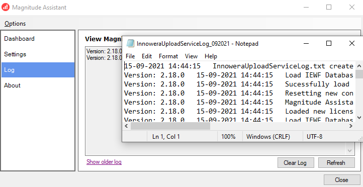 InnoweraUploadServiceLogtext file that displays the older Magnitude Assistant logs, select Show older log. Such logs can be helpful for error management. - To clear the logs that are displayed, select Clear Log.