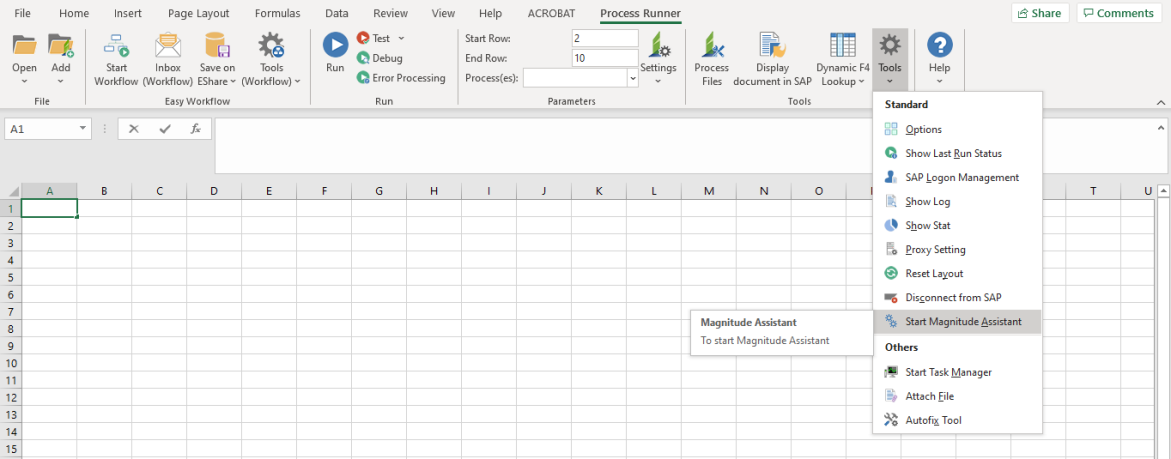 - In Process Runner Excel Add-in, select Tools > Start Magnitude Assistant.