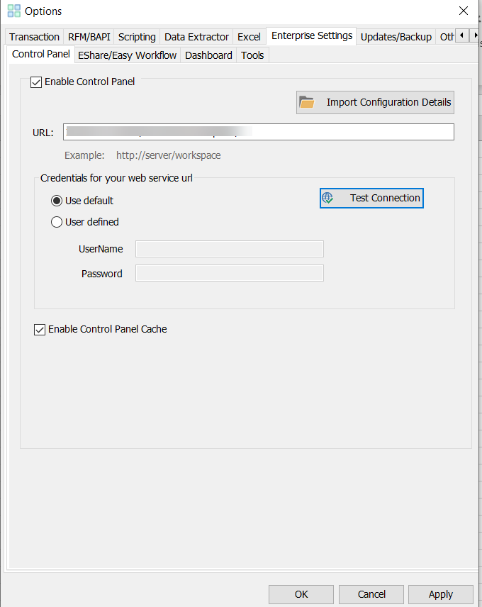 - To reduce the average time to access Control Panel server for frequent actions, select Enable Control Panel Cache. The copies of actions performed for the first time in Process Runner Excel Add-in are stored on your computer and thus the average time to access the Control Panel server is reduced.