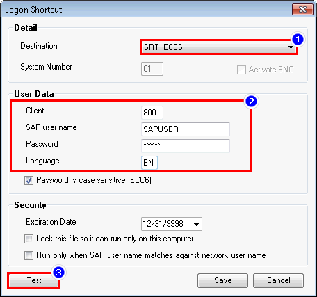 This topic describes how to create an SAP logon shortcut. You can use a logon shortcut to sign in to SAP with a predefined configuration that you have defined, relieving you from entering the logon credentials repeatedly for a Process file run.