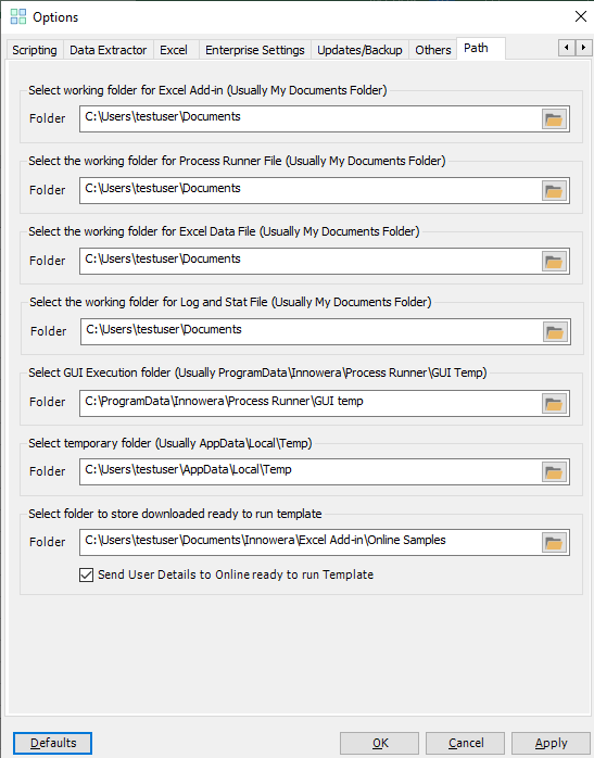 \My Documents \Innowera\ProcessFiles. - In Select the working folder for Excel Data file, browse to the folder where you want to save the Excel data file instead of the default