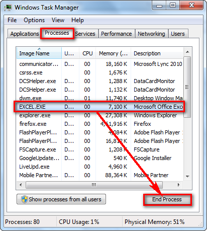 - Open Task Manager and select Processes tab. If any Excel instance is running, select the Excel.exe, and select End Process.