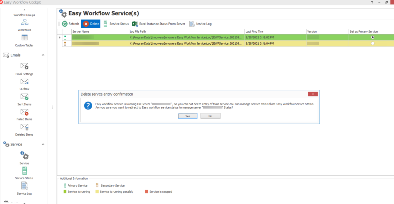 - In Easy Workflow Cockpit, select Service > Service. The Easy Workflow Service(s) window is displayed.