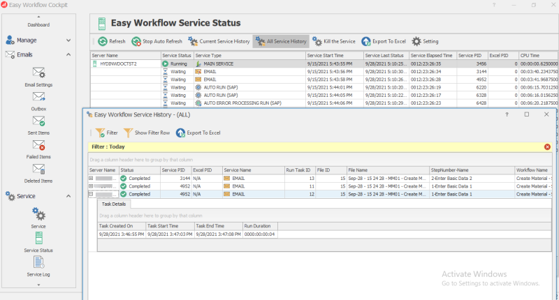 - To view the history of all the services, select All Service History. The Easy Workflow Service History - (ALL) window is displayed.