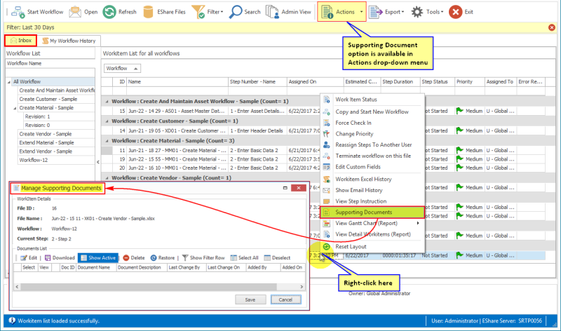 - To attach a supporting document to a work item that you have been assigned, double-click the work item from the Inbox tab in the Easy Workflow Inbox window. The work item is displayed in Excel.