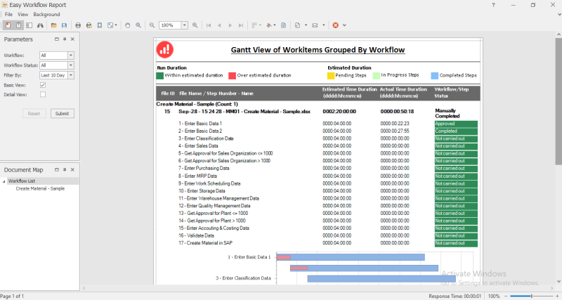 - Optionally, in the Document Map section, select a workflow. The report for the workflow is displayed.