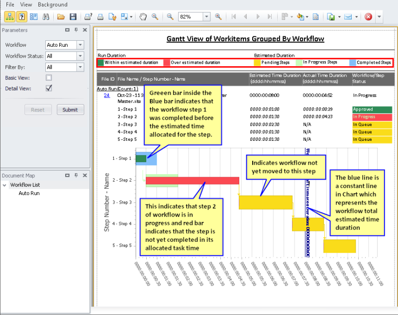 This topic describes how to view the Gantt chart that displays graphically the status of the work item and overall workflow status. Typically, tasks are shown on the vertical axis, and time is represented on the horizontal axis of a bar graph. Color coding indicates the work items that require your attention; you can make informed decisions such as escalating the priority or reassigning the task to someone else, if you are authorized to do so.