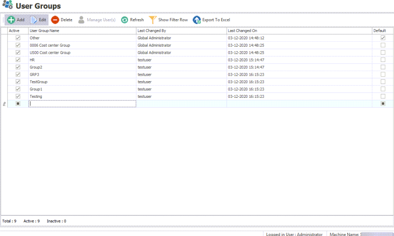 - To make the user group as the default user group, select the checkbox in the Default column. When a user is added, the user is added to this default user group.