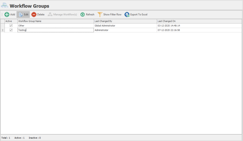 - To make the workflow group active, select the Active checkbox. By default, this checkbox is selected. The workflow group is added and is active; when you are adding or editing a workflow, the workflow group is displayed in the Member of Workflow Group(s) dropdown menu of the Workflow Designer window.