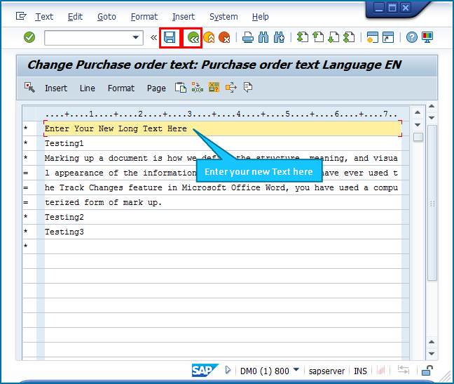 *: Indicator used for the start line of a long text paragraph; in this case, it is an asterisk (*). The asterisk (*) tag column value refers to Default Paragraph in SAP.=: Indicator used to continue the line; typically, it should be equal sign (=). This Indicator is used when the paragraph text should be displayed in continuous format. The equal sign tag column value refers to Extended Line in SAP./: Indicator used for new line in long text paragraph. If the long text consists of multiple paragraphs, then each paragraph is started with a slash/.1: Indicator used to decide whether the given text should be inserted before the existing long text. You must maintain1as the fourth indicator in the Process file.