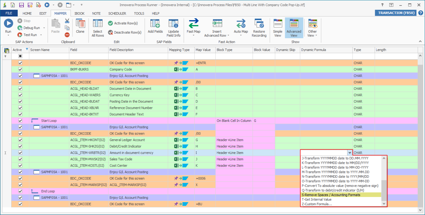 - Go to the Mapper tab and select S-Remove Spaces / Accounting Formats dynamic formula in the Dynamic Formula column.