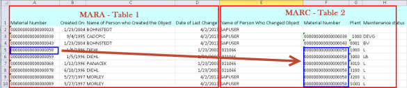 Columns A to G contains data from MARA (header) table, such as Material Number, Created On, Material Type, Material Group, Gross Weight, Net Weight, and Base Unit of Measure.