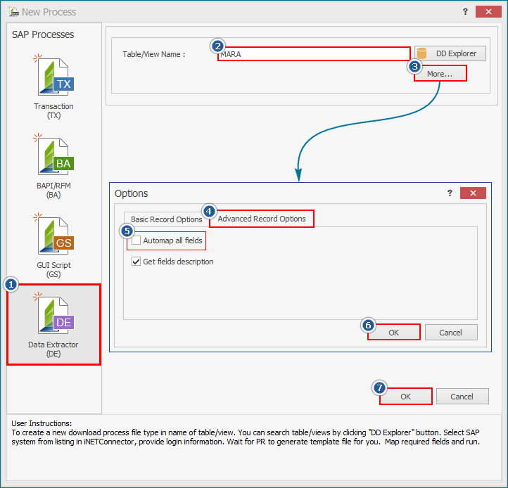 Process Connection, and browse to find the MAKT Process file. - Ensure that the status and log columns from your first Process file is not overwritten by the data extraction of the second Process file. Also, update the End Row value to get the complete extraction from the second table.