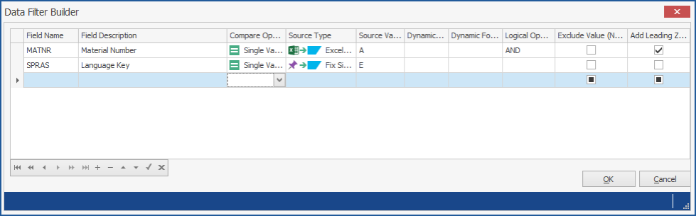 - To create a pseudo join, enter the filter to get the description of material extracted from the first Process file; optionally, enter the second filter to ensure that you extract only the description in English language.