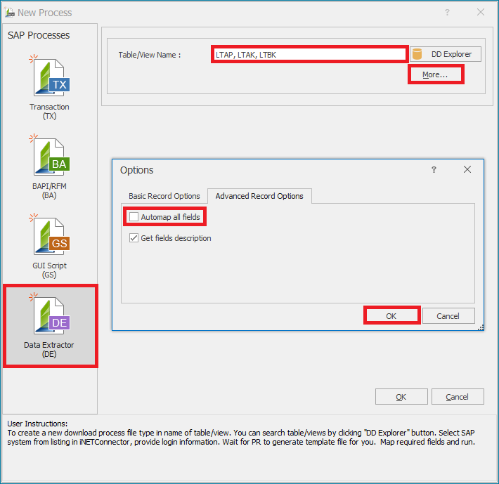 LTAP,LTAKandLTBKseparated by commas. - Select More and clear Automap all fields. You can select the required fields manually.