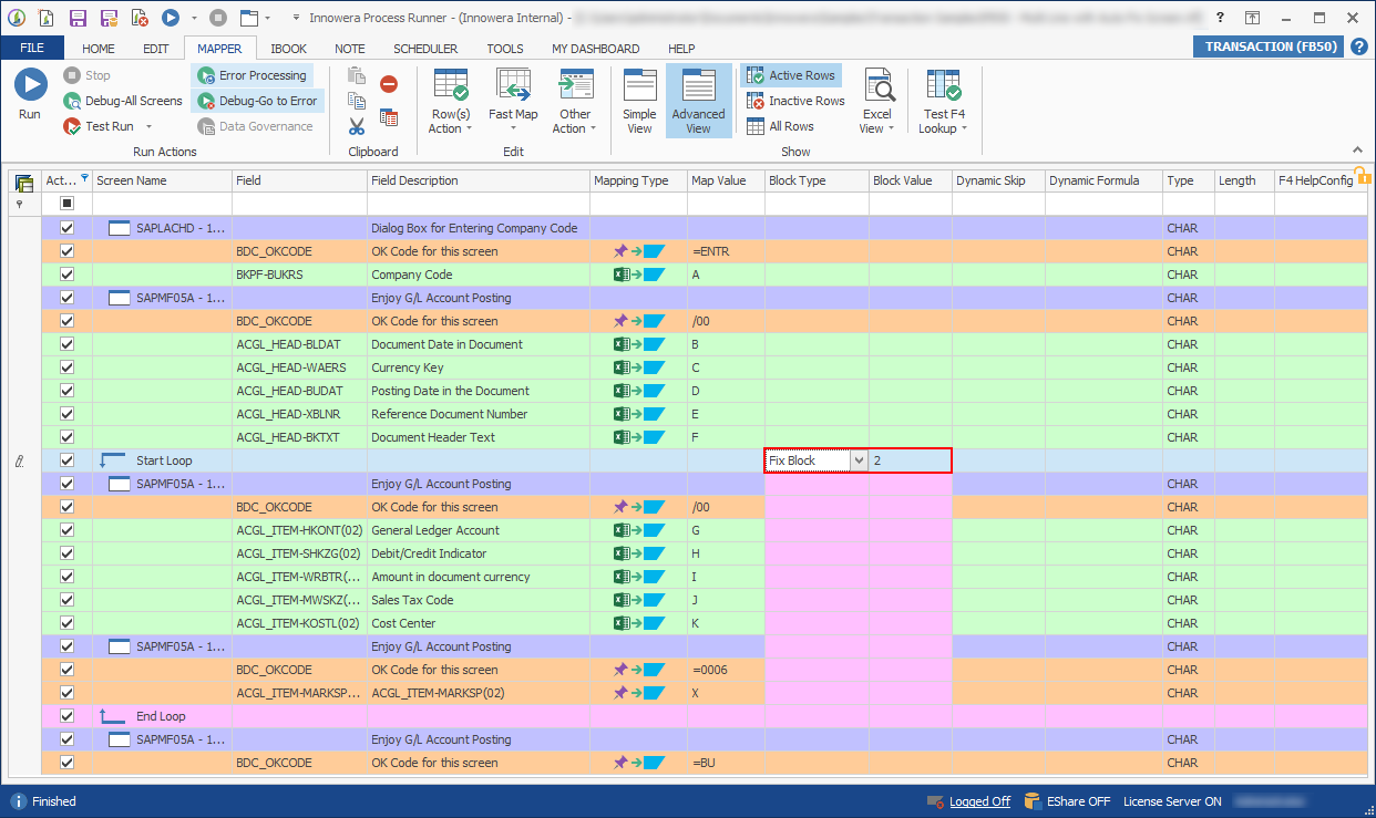 Note: The two fields to map for Header-Detail looping are Block Type and Block Value. These fields are to tell Process Runner how data in Excel file is arranged. Also, you must update the Block Type and Block Value in the same row as the Start Loop.