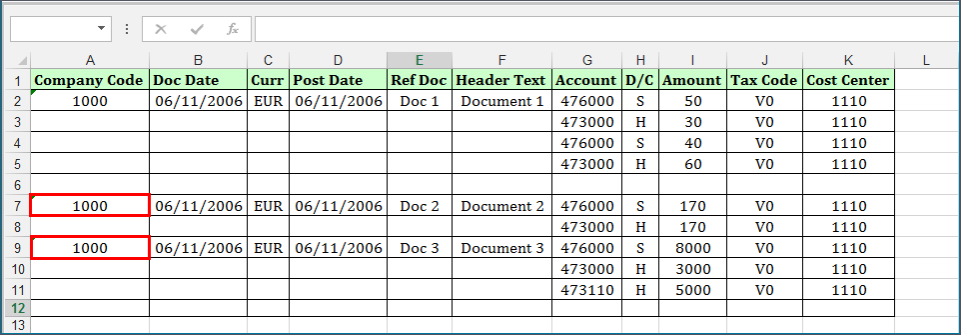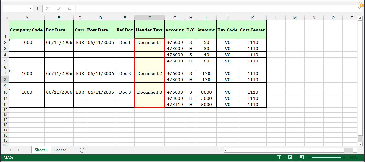 F, you can use this block type and when there is new document number, Process Runner starts a new Header-Detail transaction automatically. - On Change Ignore Blanks: Is the same as the On Change option, but instead of repeating the document number, you have blanks between the document numbers. Because a blank is a change, you want to tell Process Runner to ignore blank for considering them as a change. Process Runner ignores the blank and repeats the new Header-Detail transaction when it encounters new document number in column