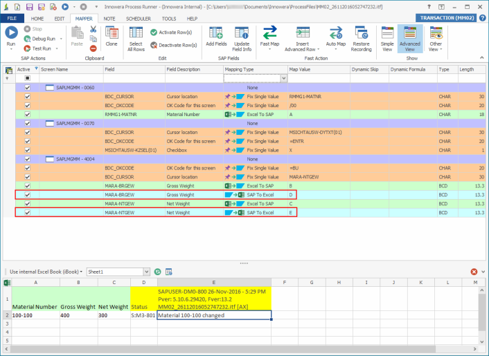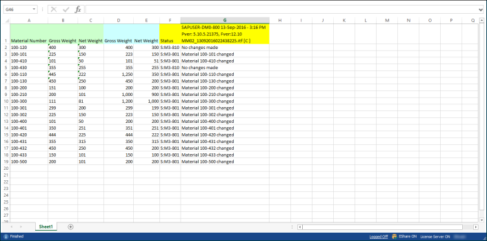 - Run the Process file. The Excel file shows gross weight and net weight before change in column D and E. It also updated gross weight and net weight from column B and C. The same transaction works for both the modes: read-only and read/write.
