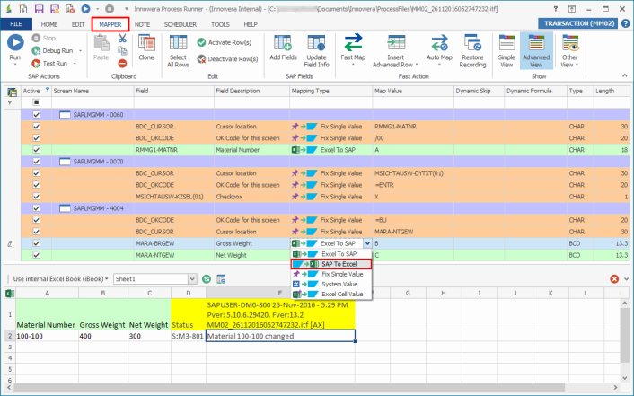 MM02. You can refer the tutorial section of Process Runner for recording a new transaction. - On the Mapper tab, right-click MARA-GREW (Gross Weight) and select Clone.