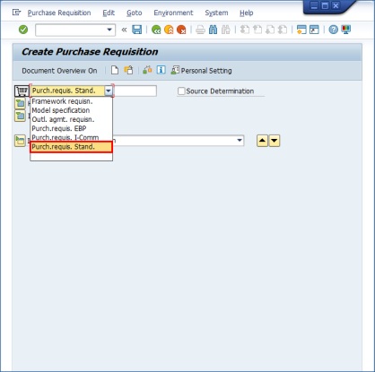 - In the Create Purchase Requisition window, select NB Purch.requis.Stand. option from the dropdown list.