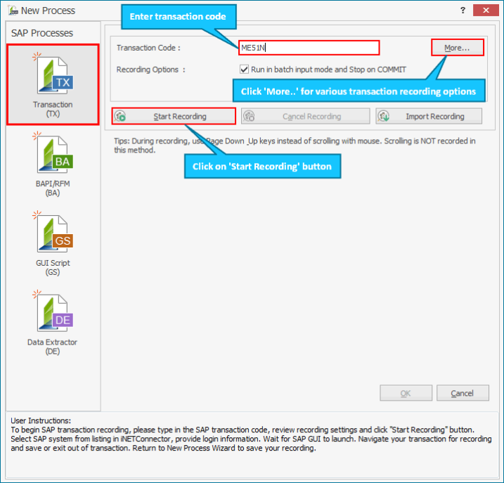 ME51Nin the Transaction Code box. - Select Start Recording. The Magnitude Connector for SAP window is displayed. Perform the following steps: