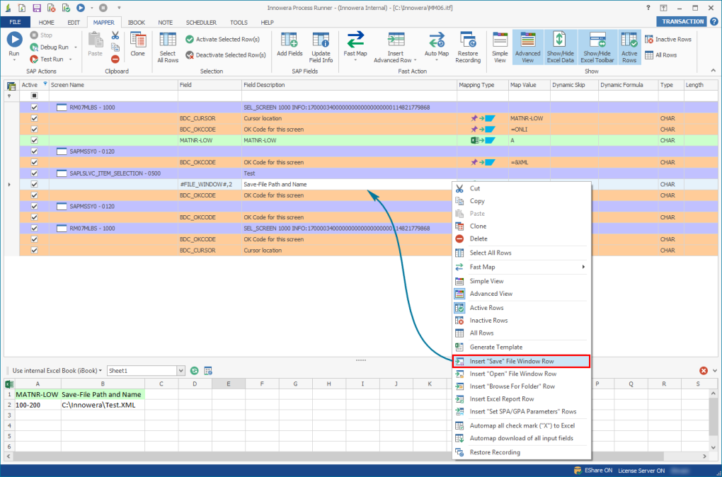 #FILE_DIALOGUE#, right-click, and select Insert "Save" File Window Row. A field called #FILE_WINDOW# is inserted. - Map this field and run the file. Process Runner automatically passes the value according to the mapping to the Windows file dialog as displayed in the first page.