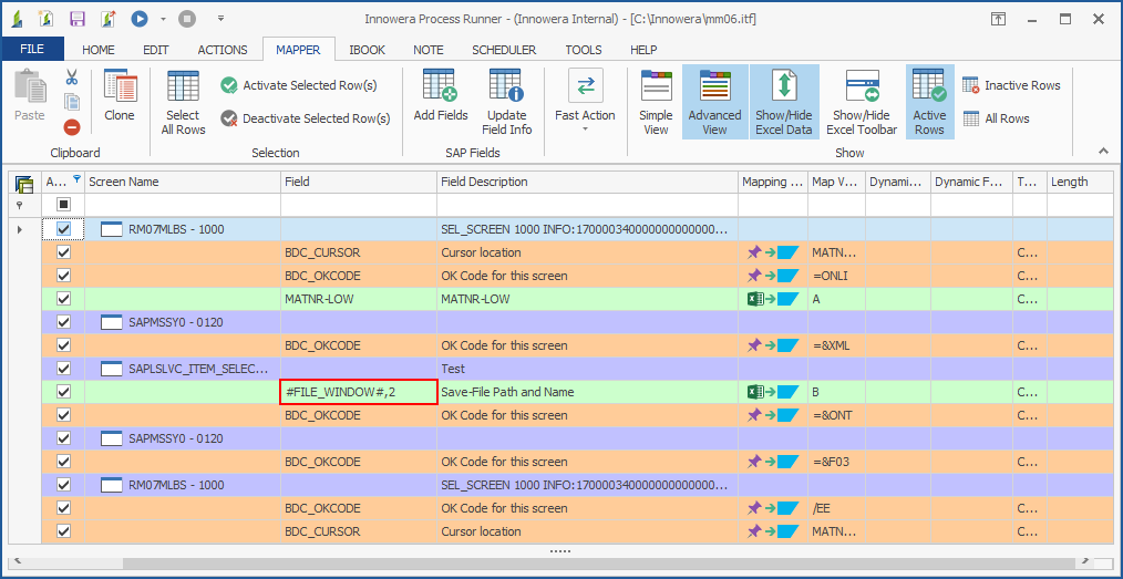 This topic describes how to use the Insert "Save" File Window Row. Process Runner handles the Windows native dialog with a Windows API function called #FILE_DIALOGUE#. When you complete the recording of a transaction, Process Runner automatically inserts #FILE_DIALOGUE# in the Field column in the Mapper grid when it finds the Windows file dialog.