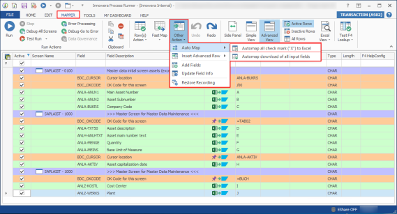 - Automap download of all input fields Creates a copy of all the recorded input field rows whose mapping type is SAP to Excel and updates the mapping type to Excel to SAP in the copied fields.