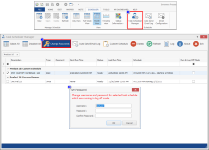 This topic describes how to change the password for a selected scheduled task in the Task Schedule Manager window. The password change is due to the Windows password requirement that can restrict the scheduled task run in the offline mode.