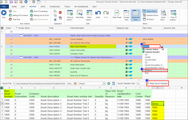- In Map Value, select the Excel column header from the dropdown options that you want to map as header cell. Similarly, in Block Value, you can also select Excel column header for the fields that you want to include in the loop. For example, if you want to map cell K3 as the header cell for Main Asset Number, you can either enter header cell name Demo within the square brackets, or select Map Excel Header and move column K to mapper, or select the value from the dropdown options as shown in the following screenshot.