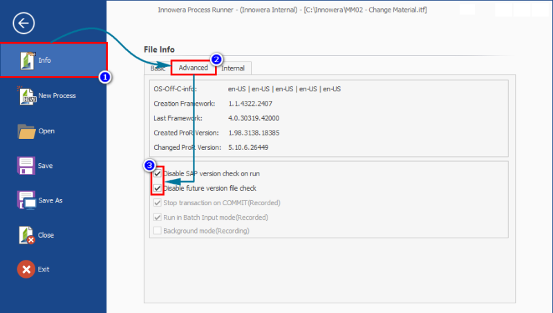 Note: For information about how to set Disable SAP version check on run and Disable future version file check globally for all Process files, see Updates/Backup.