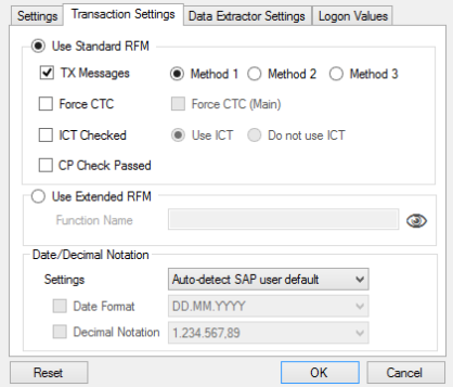 Note: The default values and options on the Transaction Settings tab are reflected from the global settings configured from the Tools > Options > Transaction tab for only the first time. Similarly, the default values and options on the Data Extractor Settings tab are reflected from the global settings configured from the Tools > Options > Data Extractor tab for only the first time. If you change the default values and options for a specific SAP system, the modified preferences are permanently set only for the corresponding SAP system.