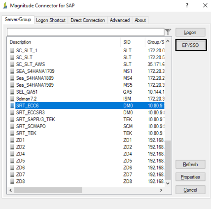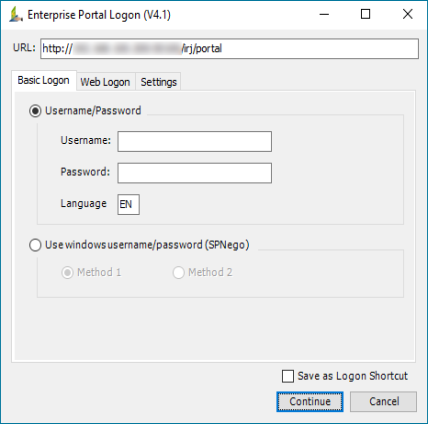 - Select the SAP system and select EP/SSO. The Enterprise Portal Logon window is displayed.