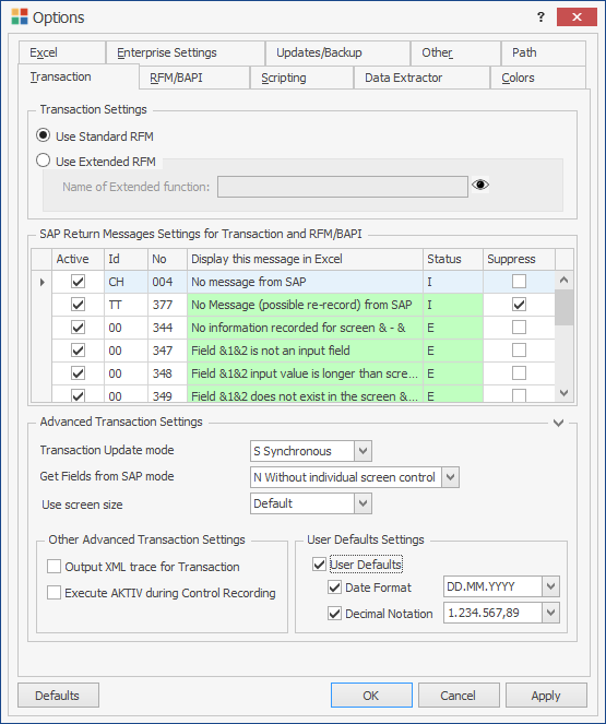 To transform the messages that SAP returns in Process Runner to custom messages, in the SAP Return Message Settings for Transaction and RFM/BAPI section, select the following options:
