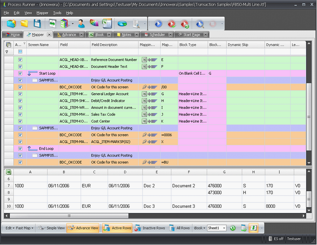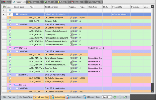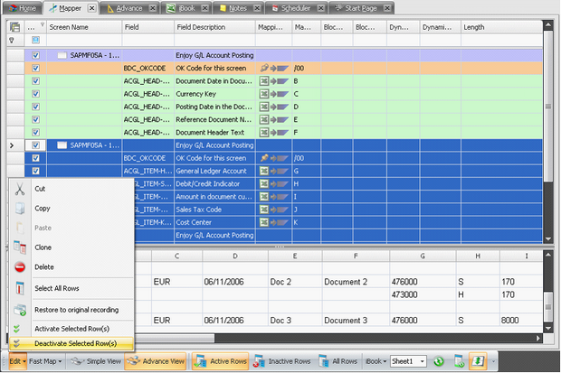 1.You will see that Process Runner automatically maps the fields to Excel Data File that we specified in New Wizard during recording. 2.Click on advance view in Mapper toolbar below. 3.Deactivate the entire mapped screen for the second item we inserted to balance the recording. That was just for the purpose of exiting out of the SAP screen, we do not need those screen.