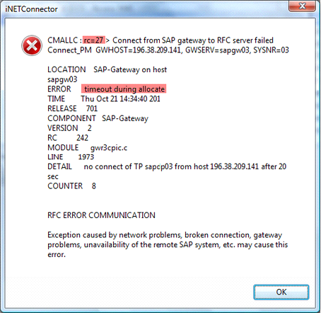 ERROR RC = 27: This error is due to unexpected interruption in the connection between SAP gateway and RFC server.