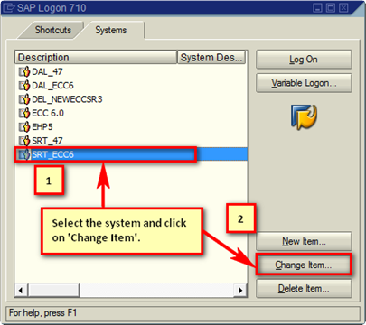 1.Find the IP address of the SAP server which you are trying to access. Open SAP logon and select the desired SAP instance and click on “Change Item”.