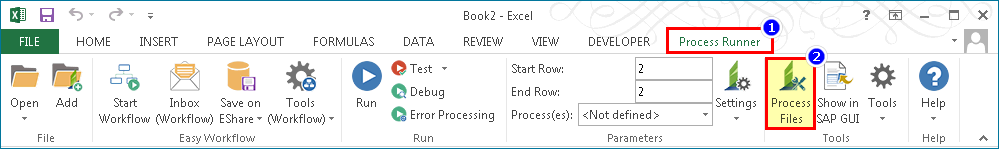 - In Process Runner Excel Add-in, on the Process Runner tab, select Process Files. The Process Files window is displayed.