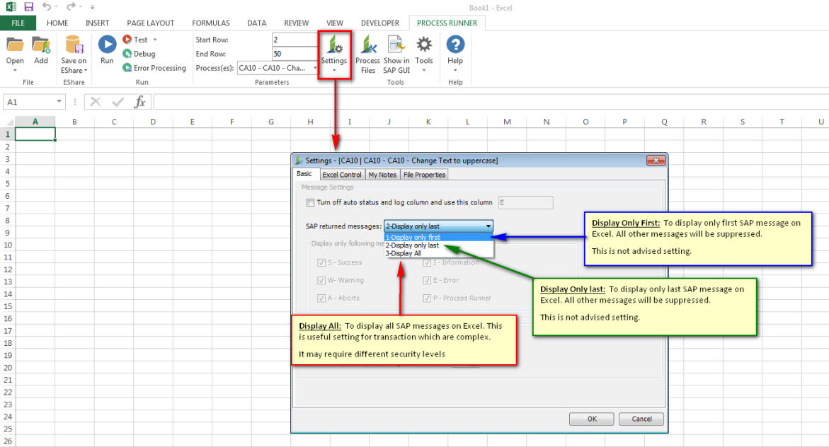 - 1-Display only first: Displays only the first message that is returned from SAP to Excel is displayed. All other SAP-returned messaged are avoided.