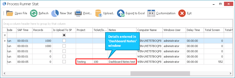 - Confirm on every Run: Indicates that you must confirm to display the Dashboard notes in the Stat window after every run.