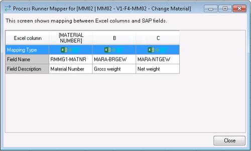- Optionally, select Mapper. The Process Runner Mapper for [<NameOfProcessFile>] window is displayed with the mapping information between Excel columns and SAP fields, such as mapping type used in the Process file, field name, and field description. If the Excel cell header is mapped in Process Runner, it gets reflected in this window. Ensure that the Excel header name in the Excel file is the same as what is displayed in the mapper screen of Process Runner.