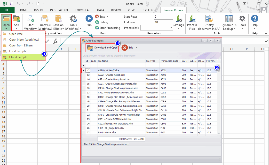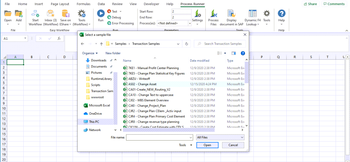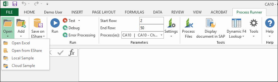 - In Process Runner Excel Add-in, perform one of the following steps from the options available in the Open dropdown menu:
