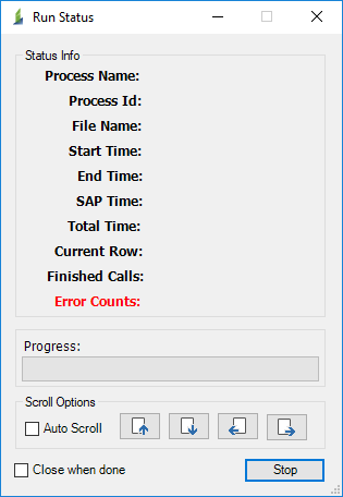 - In the Run Status window, select Auto Scroll to automatically scroll down the Excel workbook and see the last call made to SAP, when the Process file is running.
