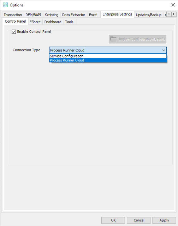 - To reduce the average time to access Control Panel server for frequent actions, select Enable Control Panel Cach. The copies of actions performed for the first time in Process Runner Excel Add-in are stored on your computer and thus the average time to access the Control Panel server is reduced.