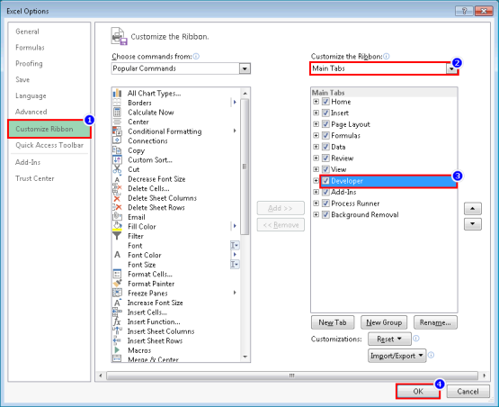 - Select Customize Ribbon, enable the Developer option, and select OK.