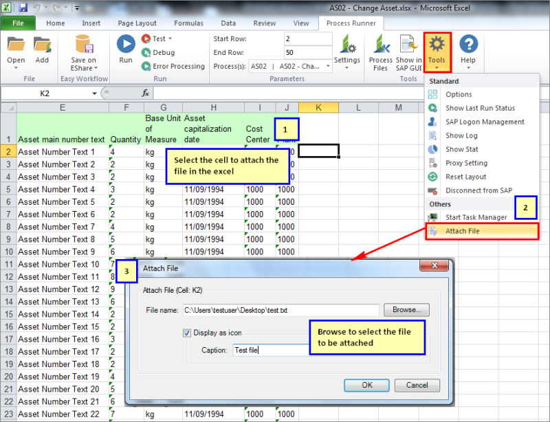 - In Process Runner Excel Add-in, open the Process file and select the cell in which you want to attach a file.