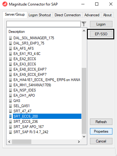 - Select the SAP system and select EP/SSO. The Enterprise Portal Logon window is displayed.