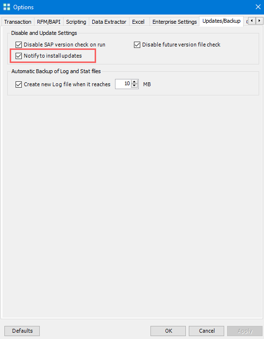 - In Process Runner Excel Add-in, select Tools > Options > Updates/Backup. The Options window with the Updates/Backup tab is displayed. Select the following options: