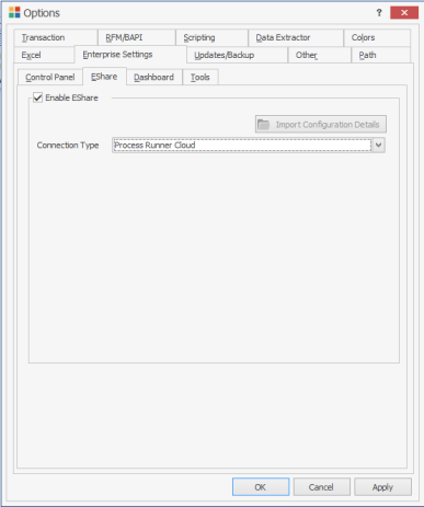 If you are using the Process Runner Cloud license model, you can integrate EShare with Process Runner Cloud using the Process Runner Cloud Configuration option in Process Runner to store, manage, and save the process files on Process Runner Cloud. For information about the Process Runner Cloud license model, contact support.