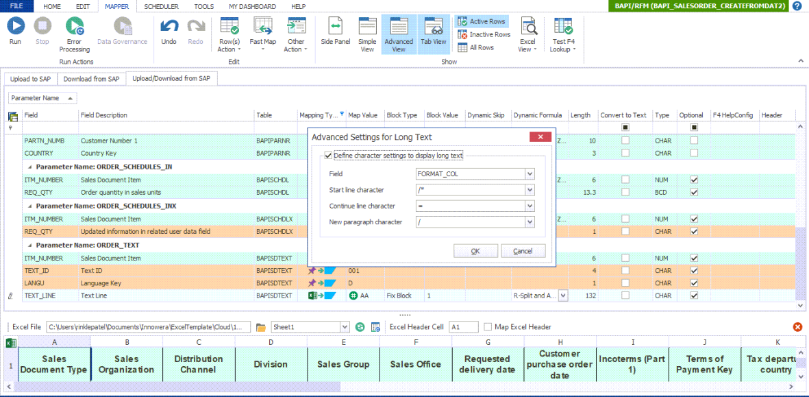 - For a BAPI/RFM Process file, to edit the default settings, select Define character settings to display long text in the Advanced Settings for Long Text window that is displayed, and select OK.